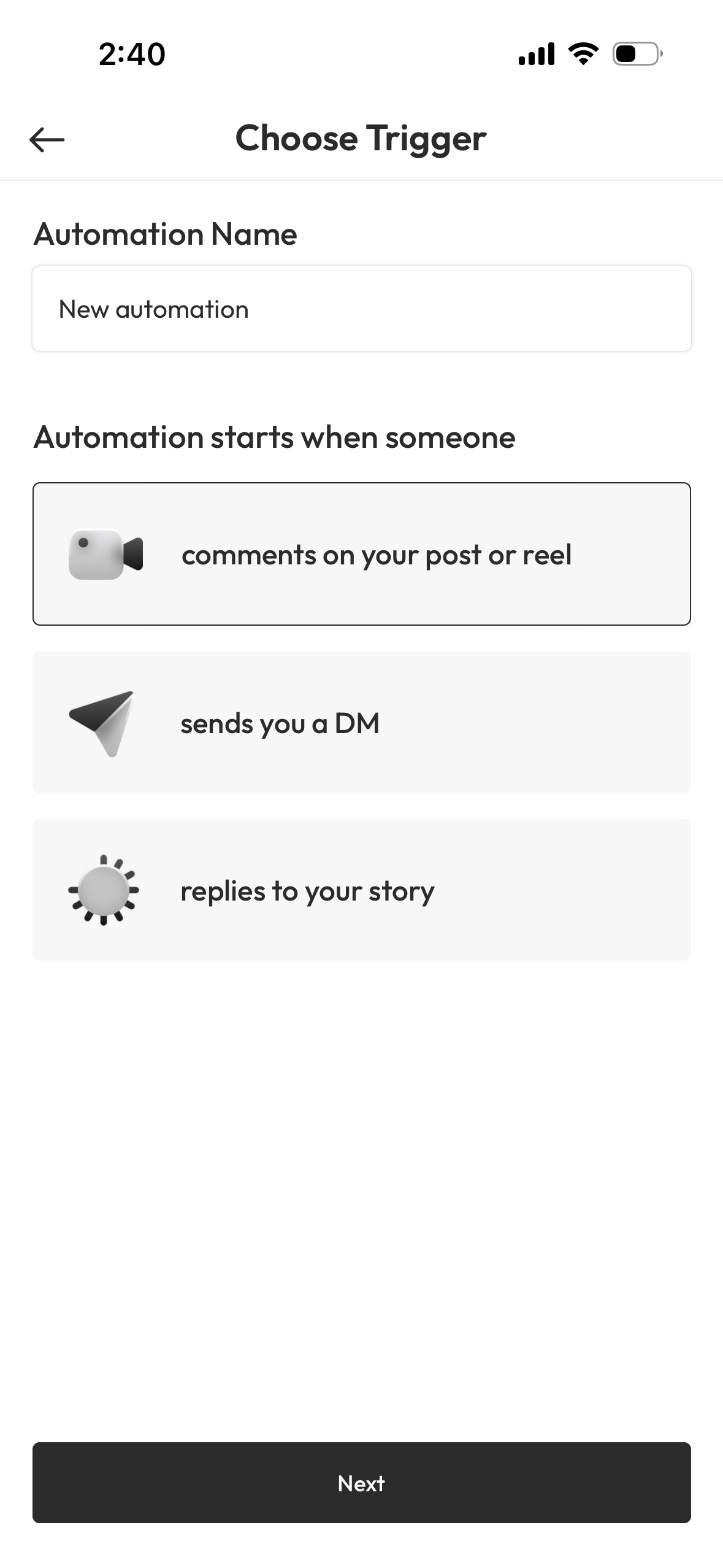 Choose actions like "New follower," "Keyword message," or "Story reply."